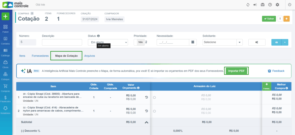 5) Importar o PDF do fornecedor na aba “Mapa de Cotação”