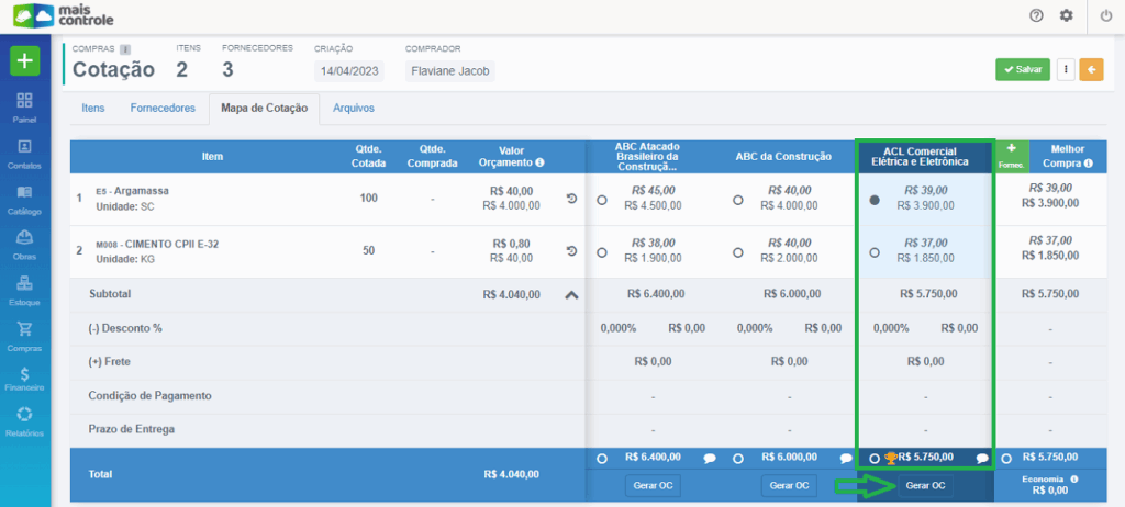 Você escolhe o centro de custo da cotação. Se preferir, também dá para buscar os itens de uma solicitação de compras já criada.