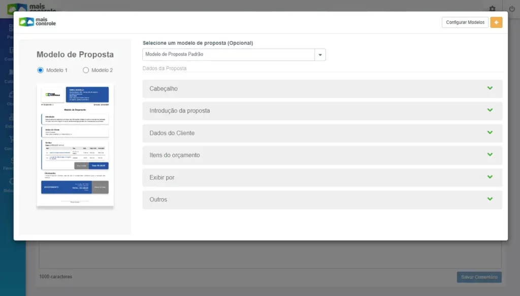 No caso do Mais Controle, por exemplo, a proposta comercial pode ser gerada diretamente a partir do orçamento, com personalização de layout, inclusão de logo e padronização visual, sem precisar refazer tudo manualmente