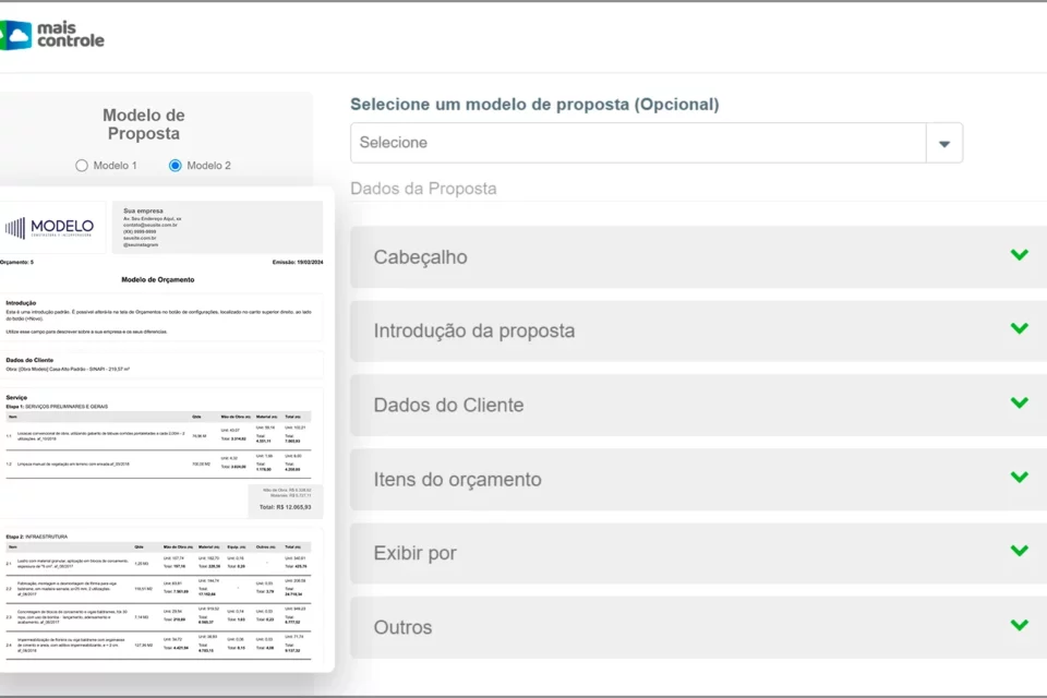 No caso do Mais Controle, por exemplo, a proposta comercial pode ser gerada diretamente a partir do orçamento, com personalização de layout, inclusão de logo e padronização visual, sem precisar refazer tudo manualmente