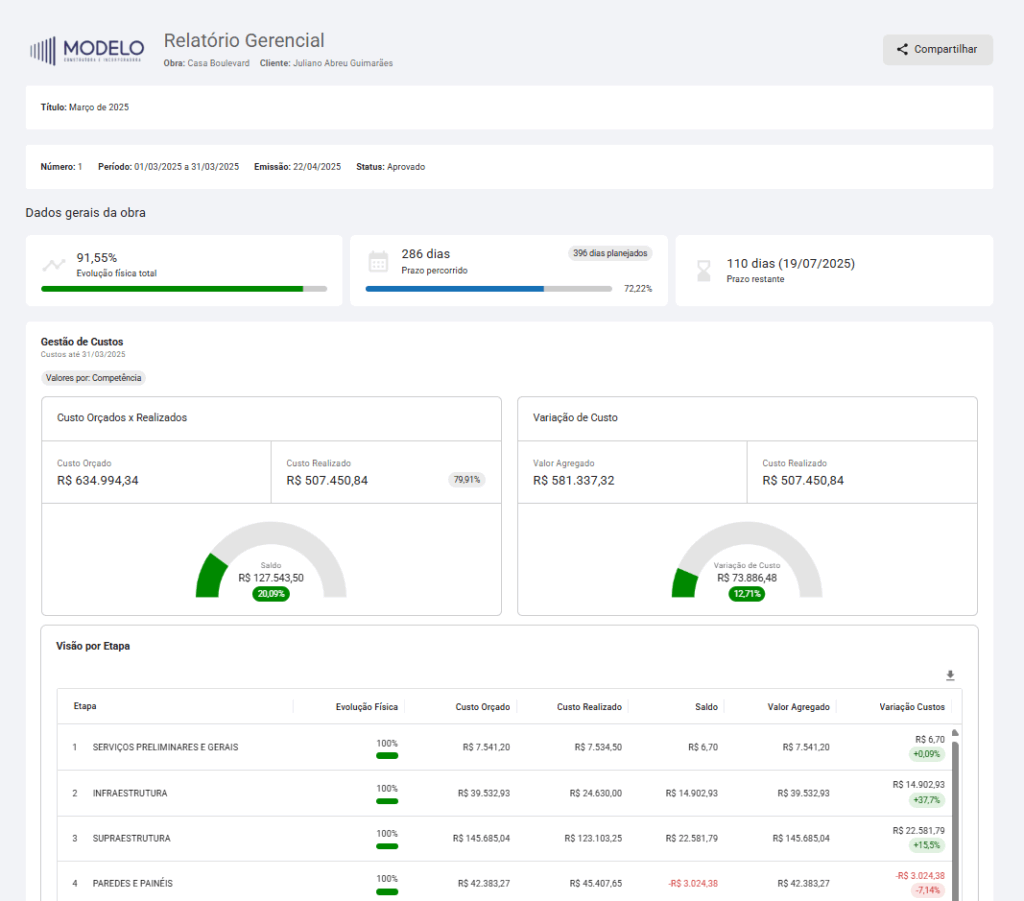 - Quinzenal ou Mensal: Adequado para obras de longa duração e com ritmo mais estável ou para reportes a níveis gerenciais mais altos, que precisam de uma visão consolidada do progresso da obra.