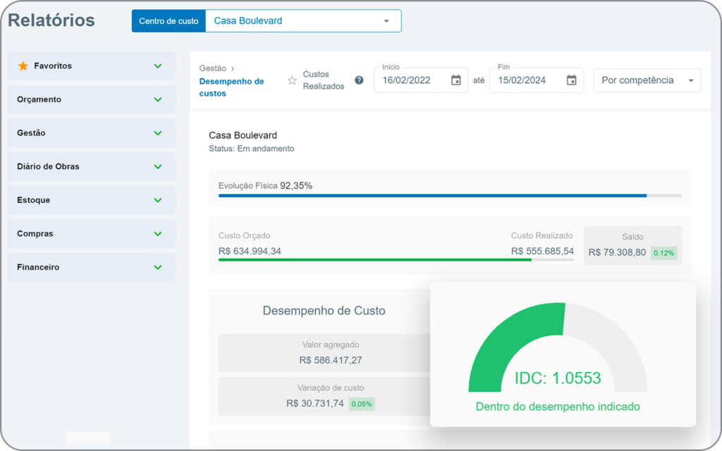 Conecta o avanço da obra ao fluxo de caixa. Assim, a construtora consegue prever desembolsos, identificar riscos de atraso e tomar decisões mais rápidas quando algo foge do previsto.